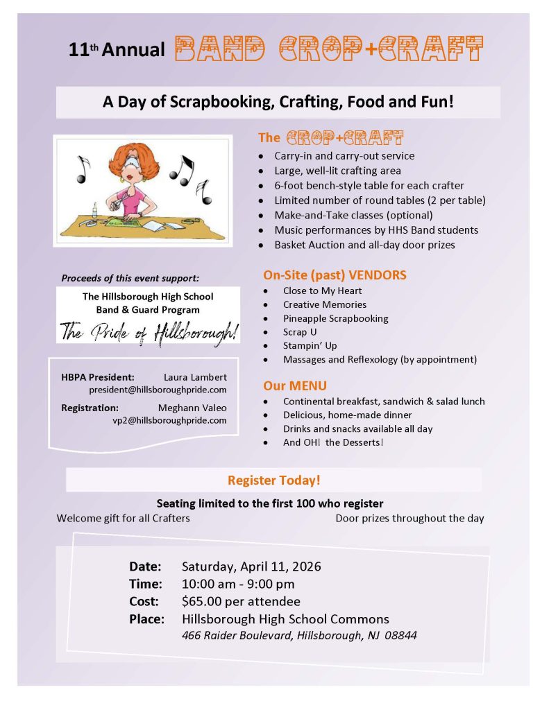 Pride of Hillsborough Band Crop ’25 SAVE THE DATE!!!! Saturday, April 26, 2025 Get excited! A full day of scrapbooking & fun!